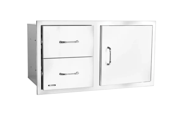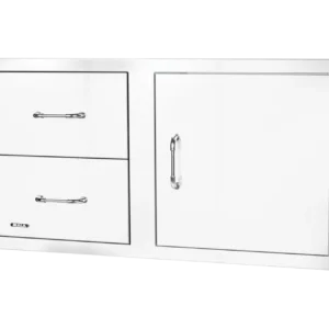 Enhance your outdoor kitchen with the 100 cm Door/Drawer Combo, featuring a robust stainless-steel construction and the contemporary Reveal design. This versatile unit includes double-lined doors and offers convenient storage for your grilling accessories and cleaning products. Its unique, reversible design stands out, allowing installation flexibility with doors that can swing left or right, adapting to your outdoor kitchen layout. The 100 cm Door/Drawer Combo provides spacious and functional storage, adding a modern touch to your culinary oasis with its sleek Reveal design.